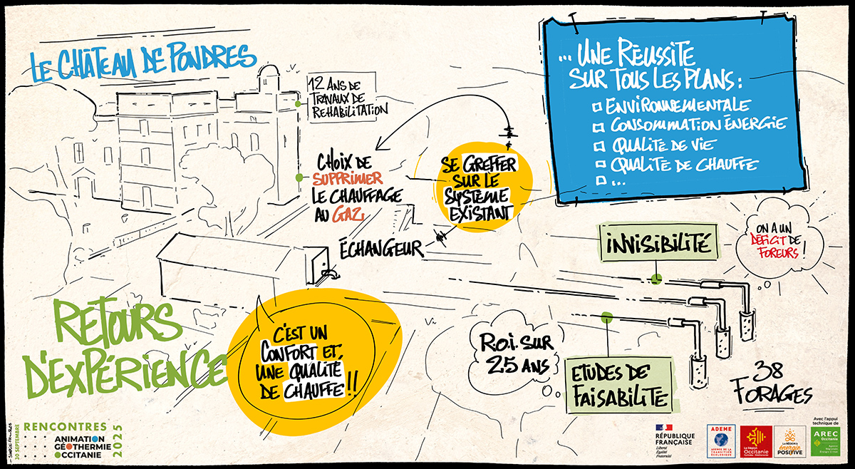 Éric Mauz, gérant du Château de Pondres à Villevieille (30), a partagé son expérience d’installation géothermique sur ce monument historique classé. Ce projet illustre la compatibilité de la géothermie avec le patrimoine bâti et l’importance d’un accompagnement technique rigoureux.